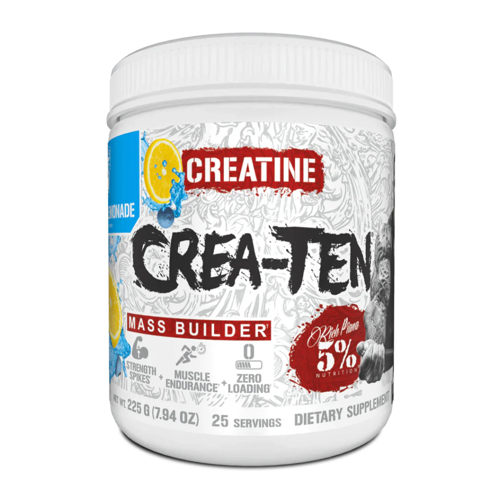 A Crea-TEN® a kreatin jelenleg elérhető leghatékonyabb formáit tartalmazza. A globális hiány és a tény miatt, hogy 5% nem fogja használni a kreatin gyengébb formáit, a jelenleg piacon lévő 9 legjobb formát választottuk. A Crea-TEN® exkluzív Creatine Accelerate Blendünket is tartalmazza. Ez az innovatív formula optimalizálja a felszívódást és drámaian javítja az állóképességet. Ez nem minden! Növeli a hidratációt és a sejttérfogatot is. A Crea-TEN ® Legendary Series változatos ízeket kínál! Ha korábban úgy gondolta, hogy ízlik, várja meg, amíg most kipróbálja. Ez a klasszikus kreatin formula, amelyet maga a férfi, Rich Piana alkotott meg. A globális hiány és a tény miatt, hogy 5%-uk nem fogja használni a kreatin gyengébb formáit, a jelenleg elérhető 9 legjobb kreatin formát választottuk. Biztos lehet benne, hogy az 5% Nutrition semmiben sem fog megállni, hogy továbbra is prémium minőségű termékeket hozzon Önnek, a hiány az átkozott. Más cégekkel ellentétben mi mindent megteszünk a munka elvégzése érdekében Ráadásul ez a hatékony kiegészítő egyvalamivel rendelkezik, amivel senki más nem rendelkezik: a Creatine Accelerate Blendünkkel. Erről szól az optimálisan felszívódó kreatin! Ha az eredményekről szeretne beszélni, ez a képlet az Ön számára. A kreatin növeli a sejttérfogatot hatalmas pumpákhoz. Ezenkívül serkenti az izomnövekedést, növeli az állóképességet és növeli az erőt. Ráadásul nincs szükség rakodásra! Naponta csak egyszer kell bevenned! Nem csoda, hogy a kreatin általában az egyik első étrend-kiegészítő, amit egy testépítő vagy sportoló kipróbál. Valójában ez egy sarokkő termék. Kétségtelenül megtalálja a legfejlettebb testépítők és sportolók kiegészítő arzenáljában. Ennek megvan az oka – működik! Az egyik dolog, amit tesz, hogy segít növelni az izom foszfokreatin-készletét, amely az ATP energiarendszer egyik összetevője. Ez több edzésenergiát jelent. Kreatinnal több ismétlést érhet el. Mit csinál még? Azt hittük, soha nem kérdezed meg. A kreatin támogatja a hidratációt és a vízbázisú pumpákat azáltal, hogy vizet von be az izomsejtekbe. Emiatt megduzzadnak a méretük. És ha belegondolsz, valószínűleg azt gondolta, hogy az egyetlen módja annak, hogy nagyszerű szivattyút szerezzen, a nitrogén-monoxid-fokozók használata. Lehet és kell is, de ne felejtsd el a Crea-TEN ® -t ! Ez a kombó újradefiniálja, hogy mennyire lehet felszívódott. Ezenkívül a kreatin javítja az erőt és támogatja az izomnövekedést. (1,2,3,4,5) Van kreatin, aztán van 5% táplálkozási kreatin! A kreatin-monohidrát egy kicsit elmarad a felszívódástól. Tudtuk, hogy találtunk egy jobb utat – a Crea-TEN ® . Ez a kiváló termék egyszer s mindenkorra megoldja a rossz felszívódás problémáját. Ennek elsődleges módja a kreatin 9 leghatékonyabb formájának kombinálása. Ez egy fejlett keveréket hoz létre, amely a kreatin leginkább felszívódó formáit használja. Ez önmagában is kivételes termékké teszi a Crea-TEN ® -t. Egy lépéssel tovább akartuk lépni, ezért beiktattuk az innovatív Creatine Accelerate Blend-ünket. Ez biztosítja, hogy izmai a legtöbbet hozzák ki kreatin keverékünkből. Végül is nem számít, mennyire hatékony egy kiegészítő, ha a szervezet nem tudja felvenni. Egy adag a következőket tartalmazza: KREATIN KEVERÉK – 5000 MG A Crea-TEN ® Legendary Series a kreatin 9 leghatékonyabb és legfelszívódóbb változatát tartalmazza. Íme, mi van ebben az erőteljes képletben: Kreatin-monohidrát – Ez az a kreatin, amitől minden kezdődött! A 90-es évek elején nagy forradalmat okozott az iparágban. A kreatin-monohidrát a rendelkezésre álló kreatin leginkább tesztelt és bevált formája, egyetlenegy sem. Ez azt jelenti, hogy a Crea-TEN® : Legendary Series - ben kellett lennie! Ennek a klasszikusnak a felszívódásának javítására ez a szabadalmaztatott változat mikronizált részecskéket használ. Ezeket a kisebb részecskéket a szervezet sokkal könnyebben felszívja. Dikreatin-malát – Íme a kreatin és az almasav kombinációja. Ez szerepet játszik az ATP energia-anyagcseréjében. A dikreatin-malát a monohidrát minden előnyével rendelkezik, ráadásul jelentősen növeli az állóképességet. Trikreatin-citrát – A kreatin-citráthoz hasonlóan ez is a citromsavhoz kötődő kreatin. Ebben az esetben három kreatin molekula van. Ez a kombináció javítja a felszívódást, és amint alább megjegyezzük, részt vesz a Krebs vagy citromsav energiaciklusában. Kreatin-citrát – Ez a változat a kreatint és a citromsavat egyesíti. Mint megjegyeztük, ez a Krebs-ciklus egyik összetevője. Citromsavciklusnak is nevezik, ez egy energiarendszer, amely a táplálékot a szervezet számára hasznosítható energiává alakítja. Az ATP energiarendszerhez kapcsolódik. (6) Kreatin-piruvát – Már láttuk, hogy a Crea-TEN ® olyan kreatinformákat  használ, amelyek közvetlenül részt vesznek az állóképességben. Míg a kreatin egy sejttérfogat növelő, az állóképesség szempontjából is fontos. Minél több ismétlést tudsz elérni, annál jobb, igaz? Emellett a felszívódás király a Crea-TEN®- ben . Ezért olyan hatékony ez a termék. Kreatin-etil-észter -hidroklorid – Íme, a monohidrát korai versenytársa. A kreatin ezen formája volt az első, amely az eredeti kreatin felszívódási problémáit célozta meg. Azóta is a kreatin-monohidrát népszerű alternatívája. Segíti a kreatint közvetlenül a véráramba szállítani. Kreatin AKG – Ez egy olyan változat, amely a kreatint egy alfa-ketoglutarát molekulához köti. Ez egy másik forma, amely növeli az edzés állóképességét. Kreatin-glükonát – Utazzunk vissza az időben, amikor a kreatin új étrend-kiegészít