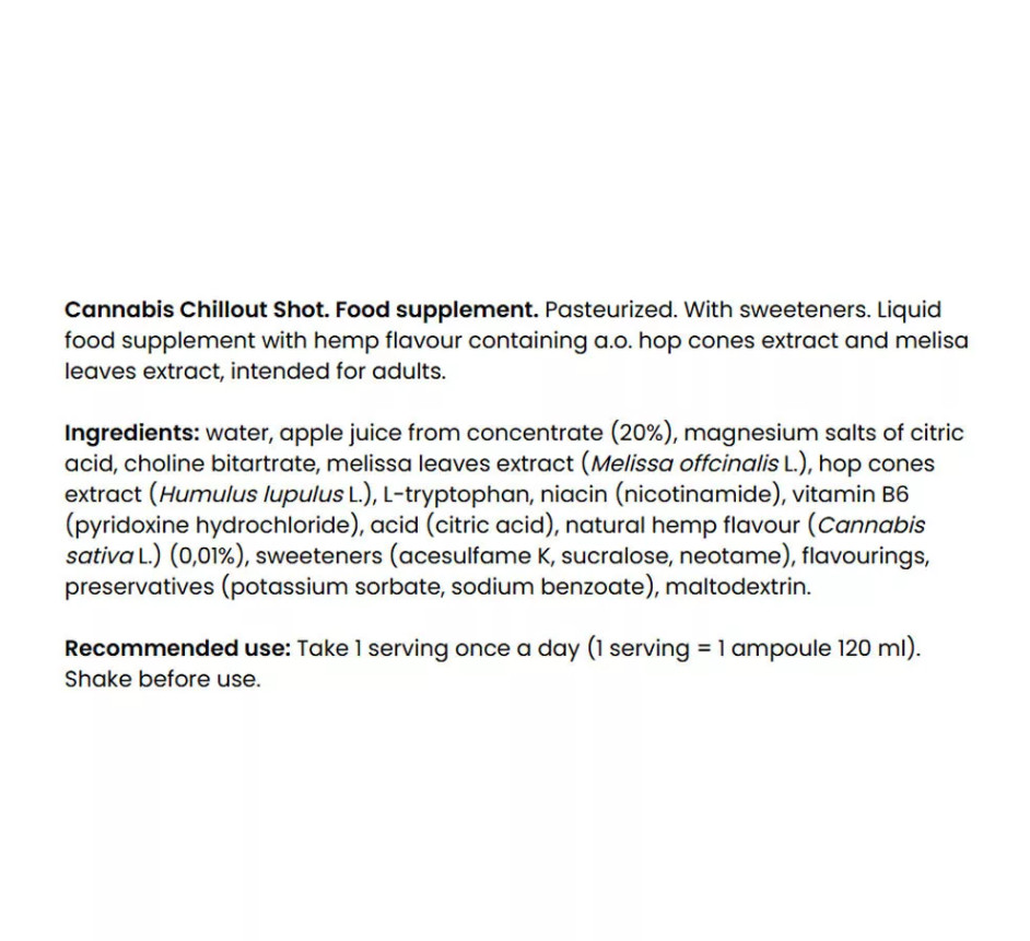 A Cannabis Chillout Shot gondosan válogatott, természetes eredetű hatóanyagok kombinációja, amely a stressz csökkentését, az idegrendszer megnyugtatását és a mentális egyensúly fenntartását támogatja – pszichoaktív összetevők nélkül.