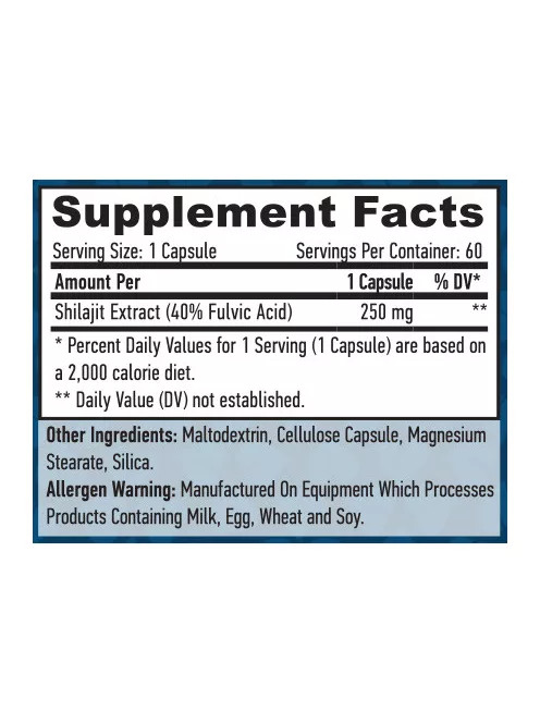 Minden kapszula megbízható mennyiségű, 40% fulvosav-tartalmú shilajit-kivonatot biztosít; stabil, kiszámítható hatásprofil a változó koncentrációjú gyantákkal szemben.