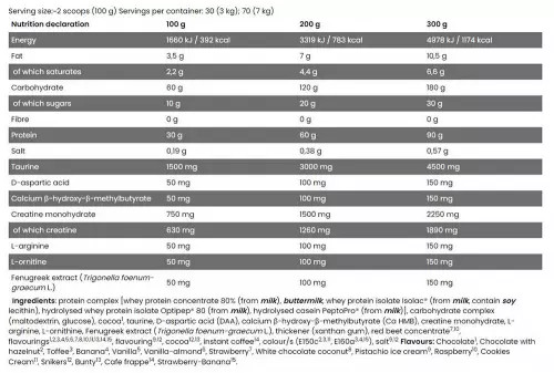 Keverj el ~2 adagolókanálnyi port (100 g) 200 ml vízzel vagy fölözött tejjel. Naponta 3-szor 1 adagot használj (közvetlenül edzés után és 2 alkalommal étkezések között).