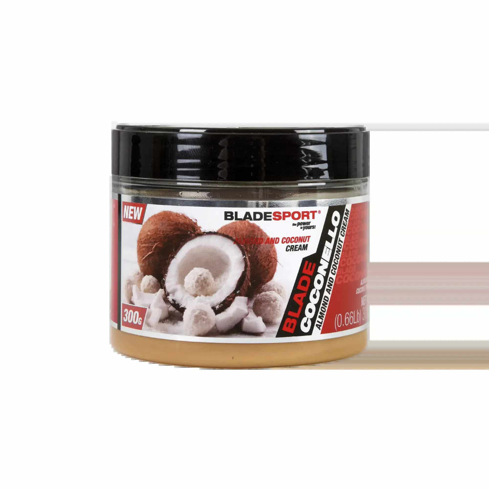 BLADE SPORT COCONELLO PRÉMIUM minőségű őrölt mandula, reszelt kókusz és természetes méz keveréke!   Egyedülálló formulája mandula-kókusz kompozícióval 100%-ban természetes összetevőkből készült.   BLADE SPORT COCONELLO nem tartalmaz se hozzáadott sót, se pálmaolajat.    BLADE SPORT COCONELLO-ban lévő mandulavaj szerepet játszik a koleszterin szint szabályozásában.   BLADE SPORT COCONELLO E-vitamin tartalmának köszönhetően ismert antioxidáns és gyulladásgátló hatása, valamint csökkenti az érelmeszesedést kockázatát.   Alacsony glikémiás indexének köszönhetően megelőzi a hasnyálmirigy túlzott terhelését és a cukorbetegeknek is kedvező szénhidrát forrás.   Lassítja a cukrok felszívódását az emésztőrendszerben és a fogyókúrázóknak is kedvez a cukrok zsírra való átalakulásának köszönhetően.    A mandula, az egyik legnépszerűbb magok egyike, kiváló fehérje forrás.   Magas aminosav-tartalmának köszönhetően, tökéletesen kiegészíti a vegán és vegetáriánus étrendet is.   A kókuszolajnak magas a laurinsav tartalma, mely egy 12 szénatomból álló telített zsír, sokkal kedvezőbb hatással van a vér koleszterin szintjére, és HDL molekulákra, mint bármely más zsírsav. Hagyományos zsírok fogyasztása esetén a telített zsírsavak csökkentik az inzulin azon képességét, hogy a szénhidrátokat az izomba juttassa, így a bevitt zsírból és a szénhidrátból is egyből testzsírt „gyárt” a máj, ráadásul nem engedi az izomzatnak, hogy „felszívja” a hasznos szénhidrátokat és aminosavakat!   Bízunk benne elnyerte tetszésed ez a kiváló termék.