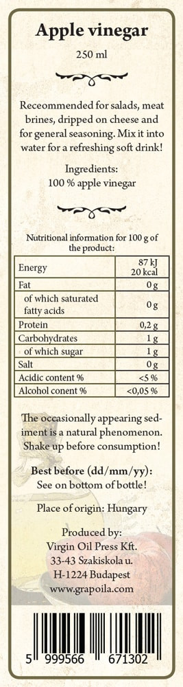 A Grapoila almaecet természetes, biológiai fermentációval készül, tartósítószert, színezéket nem tartalmaz. Kizárólag kiváló minőségű alapanyagokból, kíméletes eljárással, alacsony hőmérsékleten készül. Az erjedés során a gyümölcs cukortartalma ecetsavvá alakul, de az alapanyag beltartalmi értékének nagy része a végtermékben marad. Hozzáadott cukrot nem tartalmaz. Az ecetet a borkészítés után több hónapig tölgyfahordókban pihentetik, amíg az erjedés befejeződik. Ez az illatában is megmutatkozik (az aldehidek, ellentétben az éretlen ecettel, a körömlakkra hasonlítanak, és csípős szagúak). Az érlelés során az ízek összeérnek, az ecet harmonikussá válik. Az almaecet (5%-os savtartalom) használható főzéshez savanyításhoz, húsok pácolásához, saláták meglocsolásához, öntethez / vinaigratte-hoz és üdítőitalokhoz.