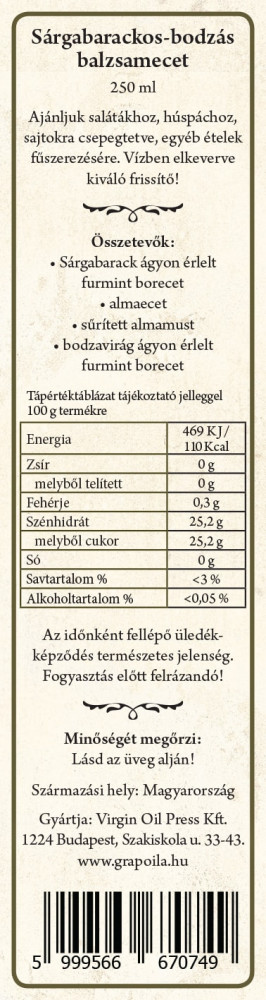 Igazi, gyümölcsös-bodzás ízkavalkád, mely a hozzáadott mustsűrítménynek köszönhetően kellemesen édeskés, így akár alkoholmentes aperitifként is megállja a helyét, sőt, desszertek, fagylaltok ízesítésére is használható. Nemcsak íze, hanem az emésztésre gyakorolt pozitív élettani hatása miatt is érdemes fogyasztani. A természetes gyártási eljárás szavatolja a kellemes ízt és a minőséget, így – valamennyi balzsamecetünkhöz hasonlóan – ez a termék is aroma-, színezék- és tartósítószer-mentes.   TÁPÉRTÉK:
