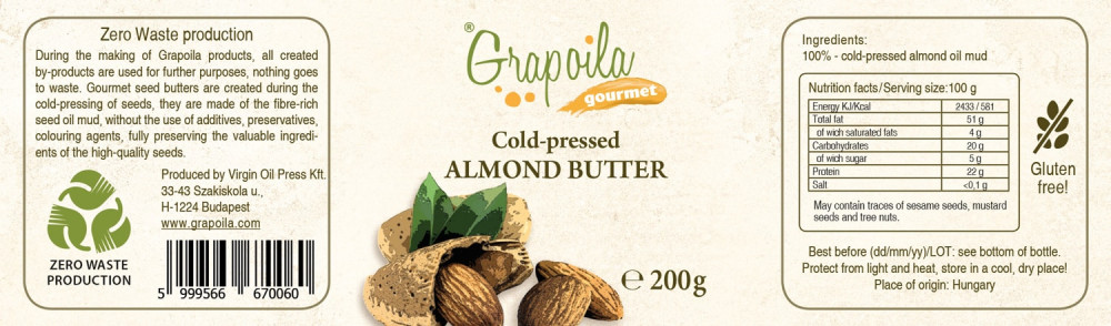 A Grapoila a Zero Waste termelést használja, vagyis minden keletkező mellékterméket további célokra használnak fel, semmi sem megy kárba. Az ínyenc magvajak a hidegen sajtolt olajok ülepítése és szűrése után készülnek, adalékanyagok, tartósítószerek, színezékek használata nélkül. A kíméletes hidegsajtolási eljárásnak köszönhetően teljes mértékben megőrzik a kiváló minőségű magvak értékes összetevőit. Magas a hidegen sajtolt olajtartalma, és a magvak finom mikrorészeit is tartalmazza. A mandulavaj gazdag telítetlen zsírsavakban, E-vitaminban és más antioxidáns összetevőkben. Jó forrása a rostoknak és ásványi anyagoknak, mint a kálium, magnézium, kalcium, valamint a kolinban, amelyek támogatják az idegrendszer bizonyos funkcióit. A mandulavaj egy sokoldalú ínyenc étel a nyers mandula természetes ízével. Használható krémek, töltelékek, szószok, péksütemények készítéséhez, vagy egyszerűen turmixokhoz és turmixokhoz adható.