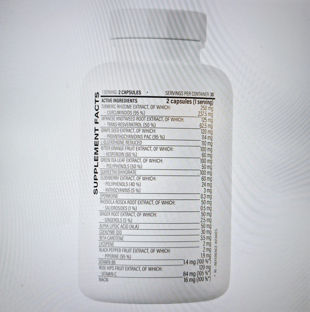 Fogyasztási javaslat: Fogyasszon naponta 1 adagot (2 kapszulát). Ne alkalmazza olyan személyeknél, akik hajlamosak vesekő kialakulására, vagy akik vesekövességben szenvednek.  Aktív összetevőkMennyiség/adag% RI*Kurkuma gyökér kivonat250 mg-- ebből kurkuminoidok (95%)237,5 mg-Japán keserűfű gyökér kivonat125 mg-- ebből transz-rezveratrol (50%)62,5 mg-Szőlőmag kivonat120 mg-- ebből PAC proantocianidinok (95%)114 mg-Redukált L-glutation110 mg-Keserűnarancs gyümölcs kivonat100 mg-- ebből heszperidin (60%)60 mg-Zöld tea levél kivonat100 mg-- ebből polifenolok (50%)50 mg-Kvercetin100 mg-Fekete bodza kivonat60 mg-- ebből polifenolok (40%)24 mg-- ebből antociánok (5%)3 mg-Spermidin0,3 mg-Rhodiola rosea kivonat50 mg-- ebből salidrozidok (1%)0,5 mg-Gyömbér gyökér kivonat50 mg-- ebből gingerolok (5%)2,5 mg-Alfa-liponsav (ALA)50 mg-Koenzim Q1030 mg-Béta-karotin3,5 mg-Likopin2 mg-Fekete bors gyümölcs kivonat2 mg-- ebből piperin (95%)1,9 mg-B6-vitamin 1,4 mg100%Csipkebogyó kivonat120 mg-- ebből C-vitamin84 mg105%Niacin16 mg100% *NRV%: napi beviteli referenciaérték %-a egy átlagos felnőtt számára. Összetevők : Kurkuma rizómakivonat - 95% kurkuminoidok, térfogatnövelő anyag: hidroxipropil-metil-cellulóz; csipkebogyó gyümölcskivonat - 70% C-vitamin, japán csomós gyökér kivonat - 50% transz-rezveratrol, szőlőmag kivonat - 95% proantocianidin (PAC), L-glutation csökkentő, keserű narancs gyümölcskivonat - 60% heszperidin, zöld tea levélkivonat - 50% polifenol, kvercetin dihidrát (Sophora japonica L. gyümölcsök), béta-karotin, bodzakivonat - 40% polifenolok és 5% antociánok, rhodiola rosea gyökérkivonat - 1% szalidrozidok, gyömbérgyökérkivonat - 5% gingerolok, alfa-liponsav (ALA), likopin, búzacsíra kivonat (Triticum aestevium) spermidinben gazdag, ubikinon (Q10 koenzim), inozitol-hexanikotinát (niacin), csomósodásgátló: zsírsavak magnéziumsói; fekete bors gyümölcskivonat - 95% piperin, piridoxal 5'-foszfát (B6-vitamin).