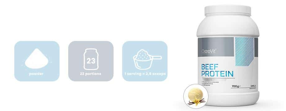 Az Ostrovit Beef Protein táplálékkiegészítő hidrolizált marhahús fehérjét tartalmaz az izomnövekedés és regeneráció támogatásához. Extra magas fehérje tartalom, 100 gramm termékben 78 gramm fehérje van. 0 gramm szénhidrát-, cukor- és zsírtartalom. Az Ostrovit Beef Protein egy kiváló minőségű, hidrolizált marhahús fehérjepor, amely könnyen emészthető és nagyon magas biológiai értékkel rendelkezik. A termék nem tartalmaz hozzáadott cukrot, ízfokozókat vagy színezőanyagokat, így tökéletes választás az egészséges életmódot követő emberek számára.