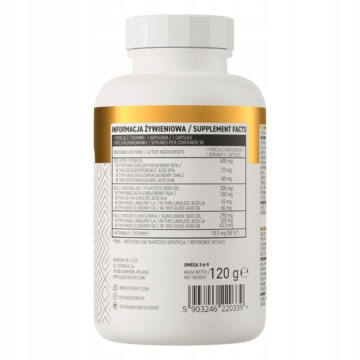 Az OstroVit Omega 3-6-9 kapszulája Omega 3 zsírsavakat (EPA, DHA, ALA), Omega 6 zsírsavat (LA) és Omega 9 (OA) zsírsavat tartalmaz. E-vitaminnal egészítettük ki termékünket. Az Omega 3 és omega zsírsavak (Omega 6 és Omega 9) esszenciális telítetlen zsírsavak. Az összes telítetlen zsírsav megfelelő aránya nagyon fontos, mert mindegyik más és más szerepet játszik a szervezetünkben. Főbb tulajdonságok: