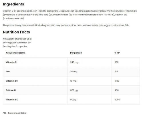 Vas - segíti a vörösvértestek és a hemoglobin megfelelő termelését. Segít a megfelelő kognitív funkciók fenntartásában. Hozzájárul a megfelelő energiaanyagcsere fenntartásához. Segíti a megfelelő oxigénszállítást a szervezetben és az immunrendszer megfelelő működését. Hozzájárul a fáradtság és a kimerültség érzésének csökkentéséhez. Fontos szerepet játszik a sejtosztódás folyamatában. Folsav - nélkülözhetetlen a ribonukleinsavak és dezoxiribonukleinsavak szintéziséhez, következésképpen a sejtosztódáshoz és a szövetek növekedéséhez, a metilációs reakciókhoz és az aminosav-anyagcseréhez. Jelentős szerepet játszik a magzati születési rendellenességek megelőzésében. A vas és a B12-vitamin mellett a vérsejtek egyik építőköve. A folsav vagy a B12-vitamin hiánya megaloblasztos vérszegénységhez vezet. B6-vitamin - segít fenntartani a megfelelő homocisztein anyagcserét és a helyes ciszteinszintézist. Hozzájárul a megfelelő energiaanyagcsere fenntartásához. Segít az idegrendszer megfelelő működésében. Hozzájárul a megfelelő fehérje- és glikogén-anyagcsere fenntartásához. Hozzájárul a megfelelő pszichológiai funkciók fenntartásához, a vörösvértestek helyes termeléséhez és az immunrendszer megfelelő működéséhez. Hozzájárul a fáradtságérzet csökkentéséhez és a hormonális aktivitás szabályozásához. B12-vitamin - hozzájárul a megfelelő energiaanyagcsere fenntartásához. Segíti az idegrendszer megfelelő működését, a homocisztein anyagcserét, a pszichológiai funkciók fenntartását és a vörösvértestek termelését. Emellett segít az immunrendszer megfelelő működésében, hozzájárul a fáradtság és a kimerültség érzésének csökkentéséhez. Szerepet játszik a sejtosztódás folyamatában. C-vitamin - növeli a vas felszívódását. Segít fenntartani az immunrendszer megfelelő működését intenzív testmozgás közben és után. Hozzájárul a megfelelő energiaanyagcsere fenntartásához. Segít az idegrendszer megfelelő működésének fenntartásában, a megfelelő pszichológiai funkciók fenntartásában és az immunrendszer megfelelő működésében. Hozzájárul a fáradtság és a kimerültség csökkentéséhez.