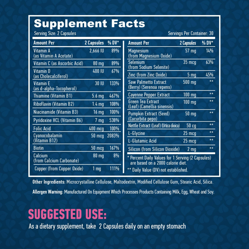 A prosztata egy kicsi, fánk alakú és méretű dió, a húgycsövet körülvevő szerv, ahol a húgyhólyagot hagyja el. A prosztata lúgos anyagot termel, amely a hím reproduktív folyadék nagy részét felépíti. A 40. életév elérésével a prosztata sejtjei gyakran nagyobbak lesznek; ezt a prosztata adenomájának vagy rövidesen (BPH) nevezik. A BPH a prosztata nem rákos megnagyobbodása, amely bizonyos esetekben ártalmatlan. Gyakran megnövekedett prosztata nyomja a húgycsövet és befolyásolja a vizelést; ez a húgyhólyaghoz kapcsolódó urológiai tünetekhez vezethet. Számos tanulmány kimutatta, hogy az 50 év feletti férfiak több mint fele prosztata -megnagyobbodásban és kapcsolódó tünetekben szenved. Ahogy öregszenek, akár 80% -uk kellemetlen tüneteket tapasztalhat, amelyek közé tartozik a gyakori vizelés, az éjszakai vizelés és a hát alsó részén jelentkező fájdalom. Saо palmetto Sao tenyere nagyon hasznos prosztataproblémákban szenvedő férfiaknak; használata jelenleg a DHT -re összpontosít. A Sao Palmetto enyhíti az ehhez az állapothoz kapcsolódó tüneteket, például a vizelés gyakoriságát és sürgősségét, a túlzott éjszakai vizelést vagy a vizelés késését. Ezenkívül ez az összetevő elősegíti az optimális gyulladáscsökkentő hatást, csökkenti a duzzanatot és elősegíti a normális vizeletáramlást. Ezenkívül a Sao palmetto egyes tanulmányokban azt mutatja, hogy képes megakadályozni a tesztoszteron DHT -vé való átalakulását. Tök Néhány évvel ezelőtt a tudósok észrevették, hogy azok a férfiak, akik olyan területeken élnek, ahol a tökmag az étrend része, alacsonyabb gyakorisággal mutattak prosztataproblémákat. Ennek oka lehet az esszenciális zsírsavak tartalma, mivel az EFA hasznosnak tekinthető a szervezet egészségére. Jó cinkforrás, a sütőtök tápanyagokat tartalmaz, amelyek elősegítik a prosztata, a hólyag és a húgyutak egészségét. Ez a leghatékonyabb, ha csalánnal és/vagy Sao palmetto -val kombinálják. Csalán A csalán pozitív hatással van a prosztata, a hólyag és a húgyutak karbantartására. Ezenkívül elősegíti a vizelet áramlását és támogatja a kevesebb vizelést. Egy adag: 2 kapszula Felhasználási javaslat: Napi 1 adagot vegyen be vízzel Csomag tartalma: 30 adag Biztonsági információk: FIGYELEM: Ne lépje túl a megadott adagot. Ha terhes, szoptat, vényköteles gyógyszert szed, mindenképpen kérje ki a kezelőorvosa véleményét mielőtt bármilyen étrend-kiegészítőt szedne. Ha mellékhatások jelentkeznek, hagyja abba a használatot és forduljon háziorvoshoz. Gyerekektől elzárva tartandó! Ne használja, ha a csomagolás sérült. Az étrend-kiegészítőket NEM szabad a kiegyensúlyozott étrend és az egészséges életmód helyettesítésére használni. Allergén figyelmeztetés: Tejet, tojást, búzát és szóját tartalmazó termékeket feldolgozó üzemben készült.