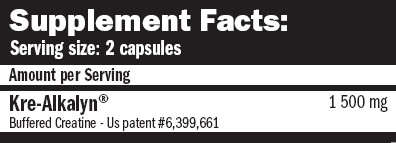 Ajánlott adagolás: Edzés napokon: 1-2 kapszula reggel, éhgyomorra, lehetőleg még 30 perccel az első étkezés előtt, majd 1-2 kapszula 30 perccel edzés előtt. Pihenő napokon: 1-2 kapszula reggel, éhgyomorra, lehetőleg még 30 perccel az első étkezés előtt, majd 1-2 kapszula 30 perccel az utolsó étkezés előtt. Ajánlott legalább 300 ml vízzel bevenni. Összetevők: pufferolt kreatin-monohidrát (Kre-Alkalyn®), zselatin kapszula (tiszta zselatinból, vízből, festékből: titán-dioxidból), magnézium-sztearát, szilícium-dioxid